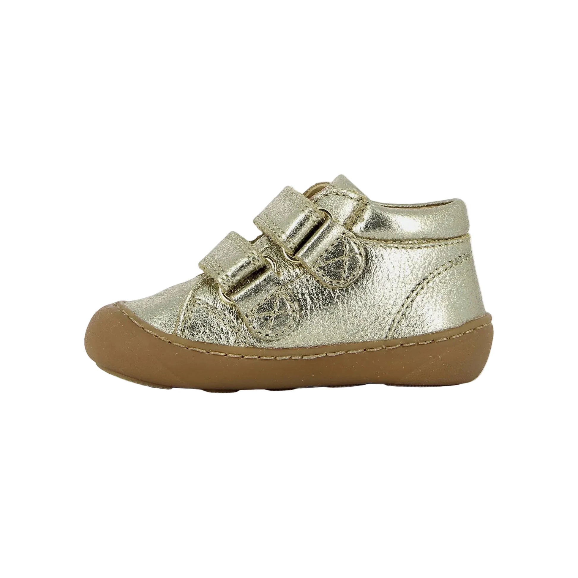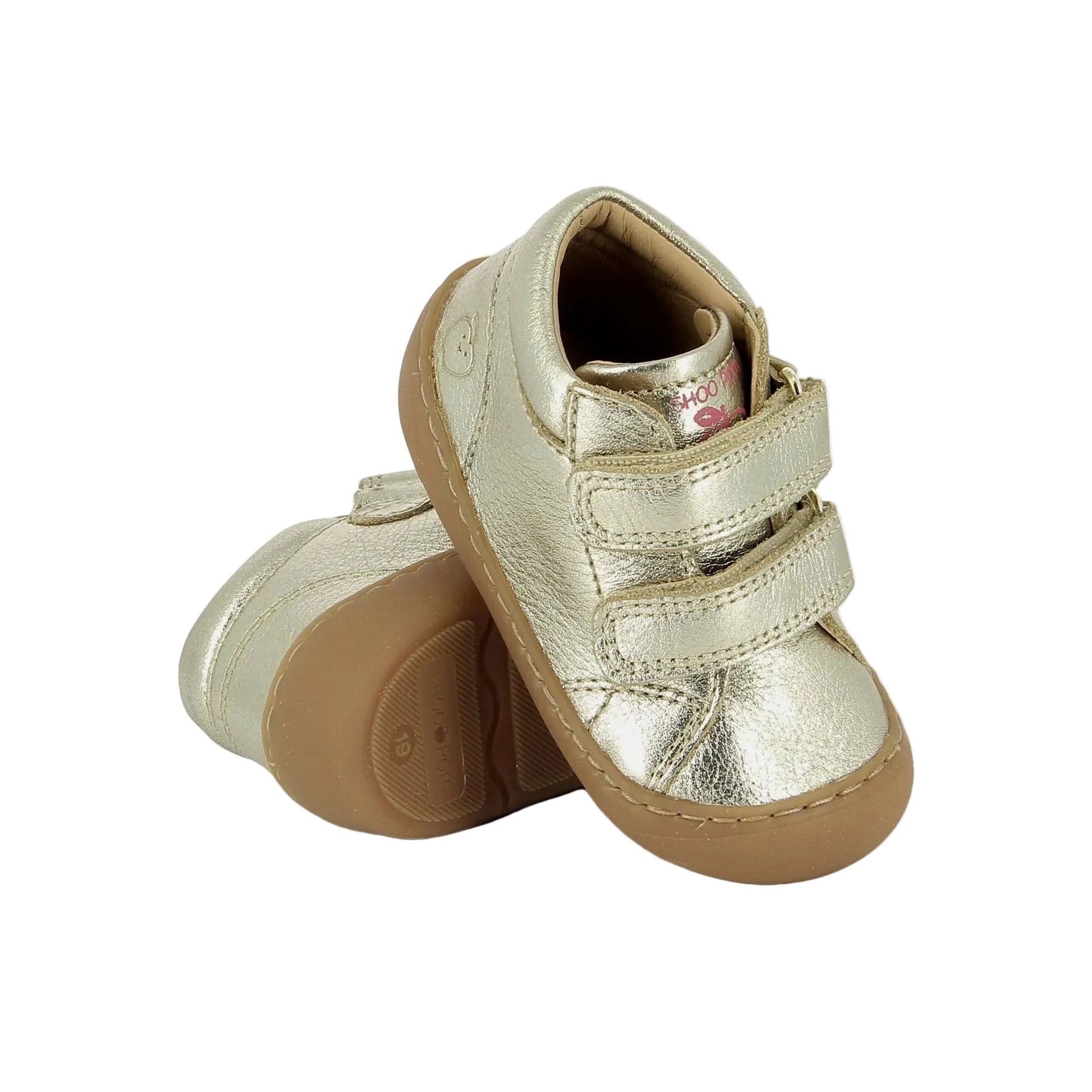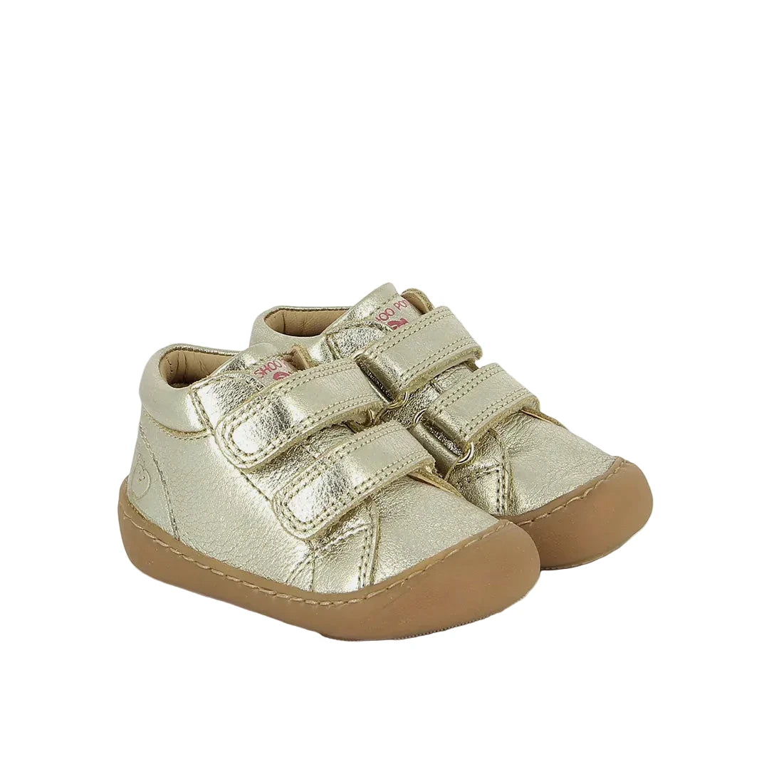Craquez pour le modèle Plum Easy Platine de chez Shoo Pom. Cette chaussure barefoot en cuir métallisé doré Shoo Pom est conçue pour accompagner bébé dans l’apprentissage de la marche, en offrant la sensation la plus proche de la marche pieds nus, tout en protégeant le pied.